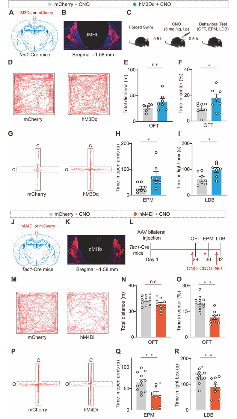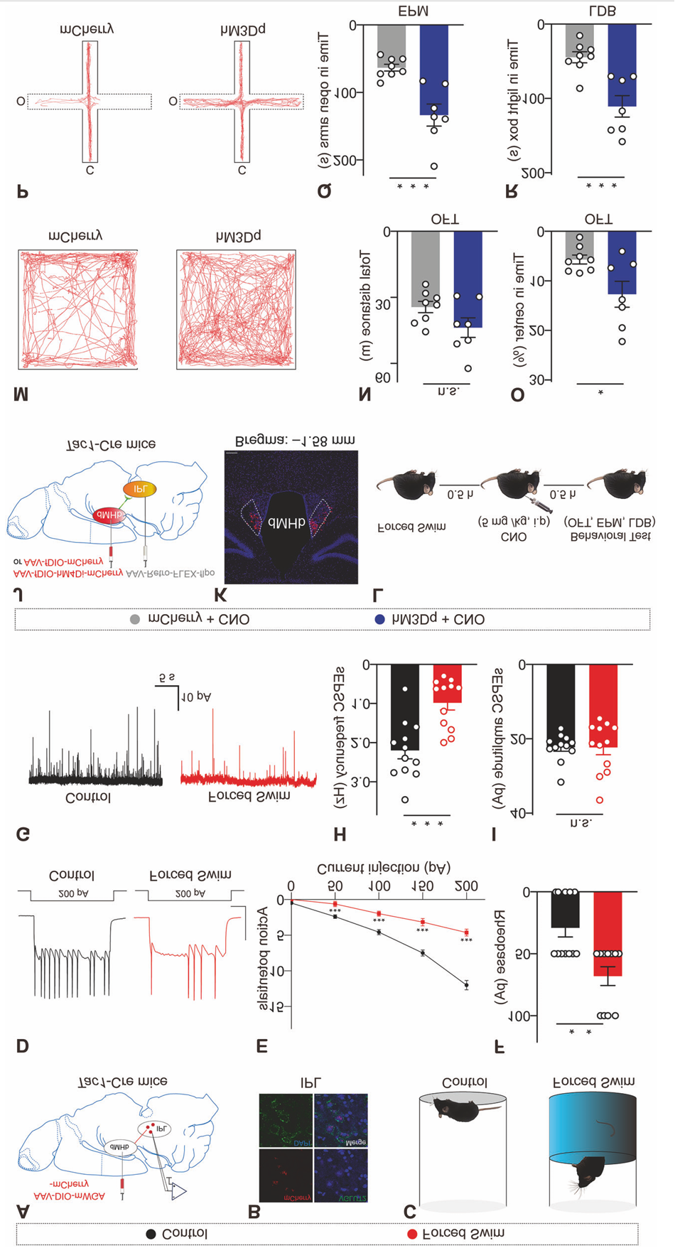 To test this, AAV-fDIO-hM3Dq-mCherry or a control virus was bilaterally injected into the MHb of Tac1-Cre mice, while a retrograde AAV-FLEX-Flpo virus was injected into the IPL. Four weeks later, behavioral tests (open field, elevated plus maze, light-dark box) showed that inhibition of the MHbTac1→IPLVGLUT circuit induced acute stress–related anxiety-like behaviors. This indicates that the MHbTac1→IPLVGLUT circuit plays a key role in regulating anxiety-like behaviors induced by acute stress.