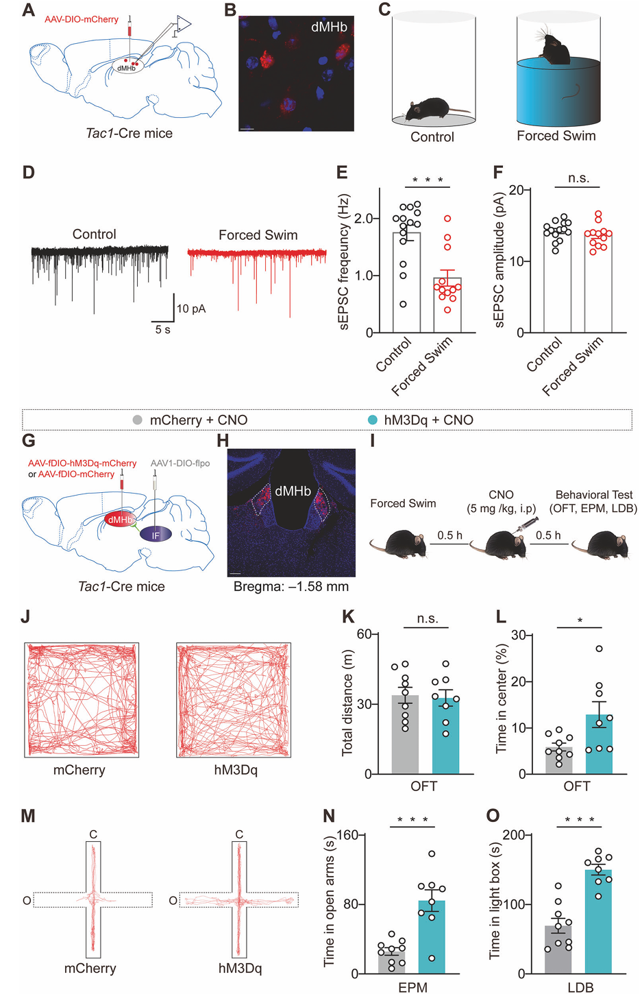 To investigate whether upstream excitatory inputs to MHb neurons are altered under acute stress, the researchers injected AAV-DIO-mCherry into the MHb of Tac1-Cre mice. Four weeks later, the mice underwent a forced swim test, and excitatory inputs to MHbTac1 neurons were recorded. Results showed that, compared with control mice, stressed mice exhibited a significant reduction in the frequency—but not amplitude—of spontaneous excitatory postsynaptic currents (sEPSCs), indicating that relevant upstream excitatory projections were altered under acute stress.