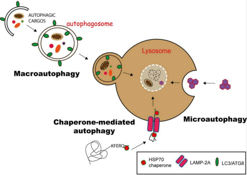 3. Chaperone-mediated autophagy (CMA): A highly selective form of autophagy. Specific chaperone proteins (such as Hsc70) recognize proteins containing particular amino acid motifs (KFERQ-like sequences) and directly “escort” them to the lysosomal membrane for translocation and degradation. This process does not involve the formation of autophagosomes.