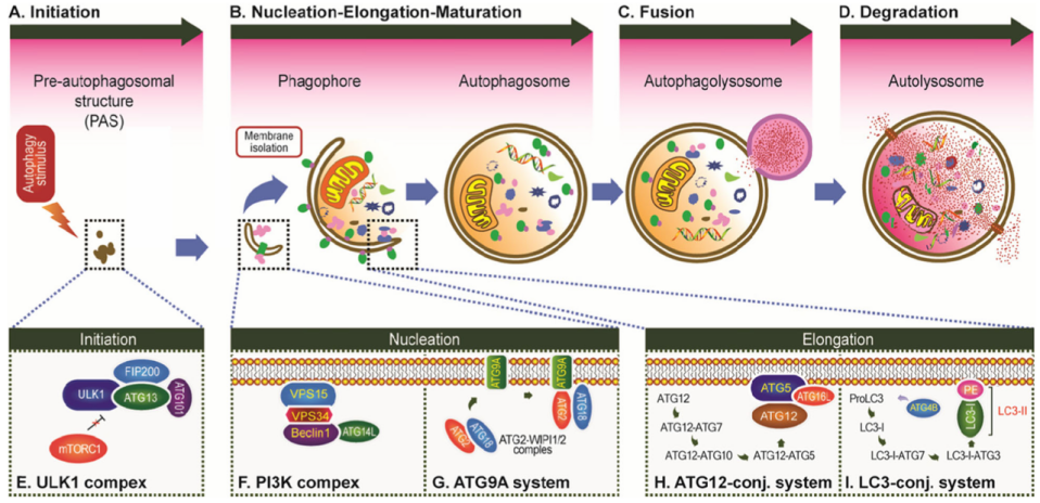 The core of autophagy is membrane reorganization within the cell. Through this process, a double-membrane vesicleforms to enclose random or specific substrates, which then fuses with a lysosome to generate an autolysosome, ultimately leading to substrate degradation. The process of autophagy can be broadly divided into four stages: 1.Initiation of autophagy When cells sense stress signals (e.g., nutrient deprivation, hypoxia, or organelle damage), autophagy-related genes (ATG family) are activated. Among these, the ULK complex (a key autophagy-initiating complex) and the Beclin-1 complex (which regulates membrane nucleation) become activated.