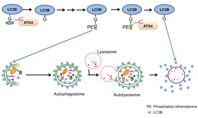 LC3 protein, also known as microtubule-associated protein 1 light chain 3, is one of the most important markers in the autophagy process. In mammals, LC3 exists in three isoforms: LC3A, LC3B, and LC3C, among which LC3B is the most widely used. Under normal conditions, LC3 exists in the cytoplasm in its soluble form, LC3-I. Upon autophagy activation, LC3-I undergoes modification through a ubiquitin-like conjugation system and is eventually conjugated to phosphatidylethanolamine (PE), converting into the membrane-bound form LC3-II. LC3-II anchors to both the inner and outer membranes of autophagosomes, assisting in autophagosome membrane expansion and sequestration of damaged organelles or proteins, while also mediating autophagosome–lysosome fusion. The level of LC3-II (e.g., detected by Western blot) or the number of intracellular LC3 puncta is commonly used to evaluate autophagic activity.