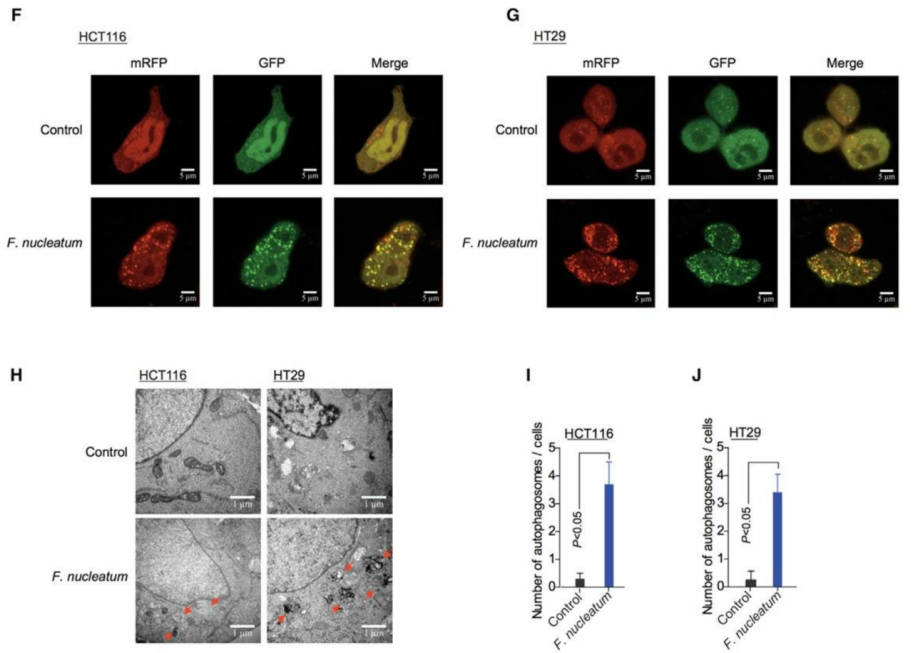 HCT116 and HT29 cells stably expressing the mRFP-EGFP-LC3 construct were co-cultured with Fusobacterium nucleatum (F. nucleatum). The results showed that after F. nucleatum induction, the number of red and green fluorescent puncta increased in both HCT116 and HT29 cells. Transmission electron microscopy further revealed enhanced formation of autophagic vesicles in HCT116 and HT29 cells co-cultured with F. nucleatum. These findings indicate that F. nucleatum can activate autophagy pathways in cells.