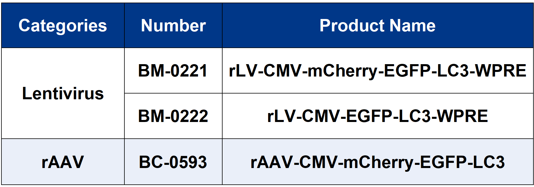 Autophagy Dual-Fluorescent Reporter Virus The mRFP-GFP-LC3 virus can be used to label and track LC3 as well as changes in autophagic flux. GFP is sensitive to acidic environments; in the acidic lumen of autolysosomes, the decrease in pH quenches GFP fluorescence. In contrast, mRFP is a stable fluorescent protein unaffected by such conditions. By observing the color changes of intracellular fluorescent puncta: newly formed autophagosomes appear as yellow puncta (GFP+/mRFP+), while autolysosomes after fusion with lysosomes appear as red puncta only (GFP-/mRFP+). This allows for a direct and dynamic assessment of autophagic flux.
