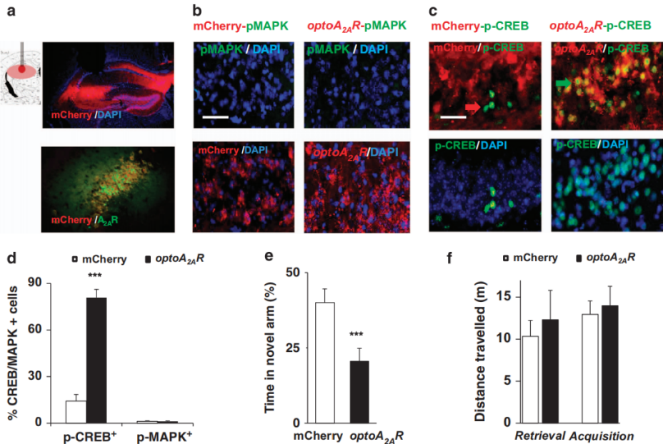 On February 17, 2015, researchers from Wenzhou Medical University published a study in Molecular Psychiatry titled“Optogenetic activation of intracellular adenosine A2A receptor signaling in the hippocampus is sufficient to trigger CREB phosphorylation and impair memory.” To test whether abnormal activation of hippocampal adenosine A2A receptors (A2ARs) is sufficient to cause memory impairment, the team developed a photosensitive adenosine A2A receptor (opto-A2AR).This receptor was engineered by replacing the intracellular loops (1/2/3) and C-terminal domain of bovine rhodopsin with the corresponding sequences of human A2AR, thereby retaining light sensitivity while mediating A2AR-specific signaling.