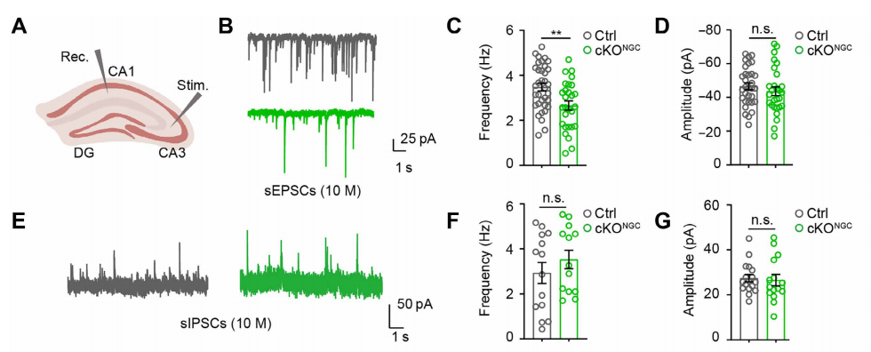 Results showed that, compared with control mice, middle-aged cKONGC mice had a significantly reduced sEPSC frequency but unchanged amplitude (Fig. 3B–D), while sIPSC frequency and amplitude remained unaffected (Fig. 3E–G).