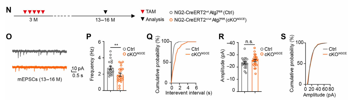 These findings indicate that autophagy deficiency in OPCs selectively impairs glutamatergic transmission without affecting inhibitory synapses.