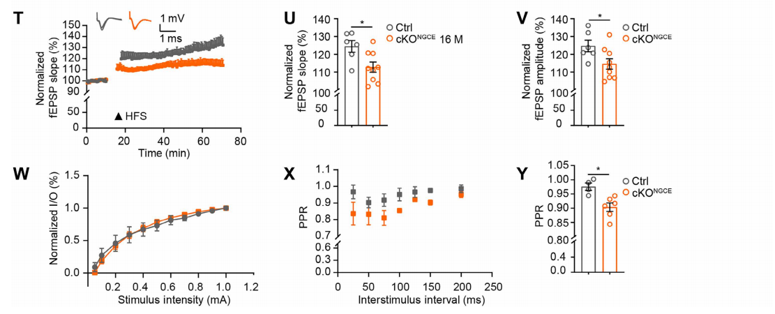 Results showed that cKONGCE mice exhibited reduced fEPSP peak slope and incomplete recovery after 60 minutes (Fig. 6T–V), indicating long-term synaptic plasticity impairment.