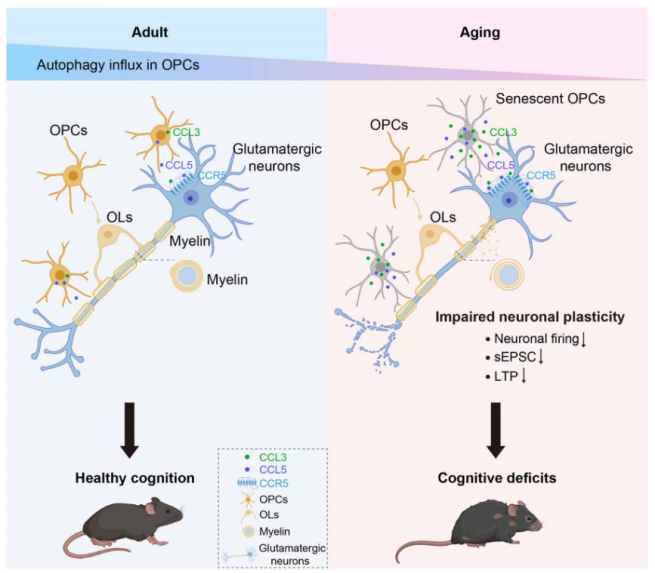 Decreased autophagic flux in OPCs of aged mice → Impaired clearance of senescence-related cellular waste, leading to OPC senescence → Senescent OPCs secrete SASP factors CCL3 and CCL5 → CCL3/CCL5 bind to CCR5 receptors on glutamatergic neurons → Inhibition of presynaptic Ca²⁺ release → Impaired glutamatergic transmission, reduced neuronal excitability, and suppressed LTP → Decreased neuronal plasticity → Ultimately resulting in cognitive decline
