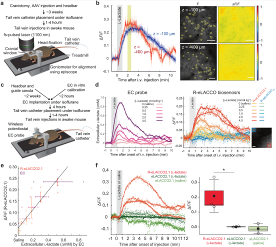 To further confirm its ability to monitor extracellular L-lactate dynamics, the team simultaneously recorded R-eLACCO2.1 fluorescence and electrochemical (EC) L-lactate signals from an EC probe implanted in vS1 after in vitro calibration (Fig. 5c–d). Both the fluorescent and EC signals rose and fell in accordance with lactate concentrations; saline injections produced small R-eLACCO2.1 responses for unknown reasons (Fig. 5d). Imaging showed a strong correlation between R-eLACCO2.1 fluorescence and EC probe signals (Fig. 5e), confirming the sensor’s ability to report extracellular L-lactate. In vivo, R-eLACCO2.1 exhibited stronger fluorescence responses to systemic lactate injection compared with the GFP-based sensor eLACCO2.1 (Fig. 5f). Together, these data establish R-eLACCO2.1 as a robust extracellular L-lactate sensor in vivo.