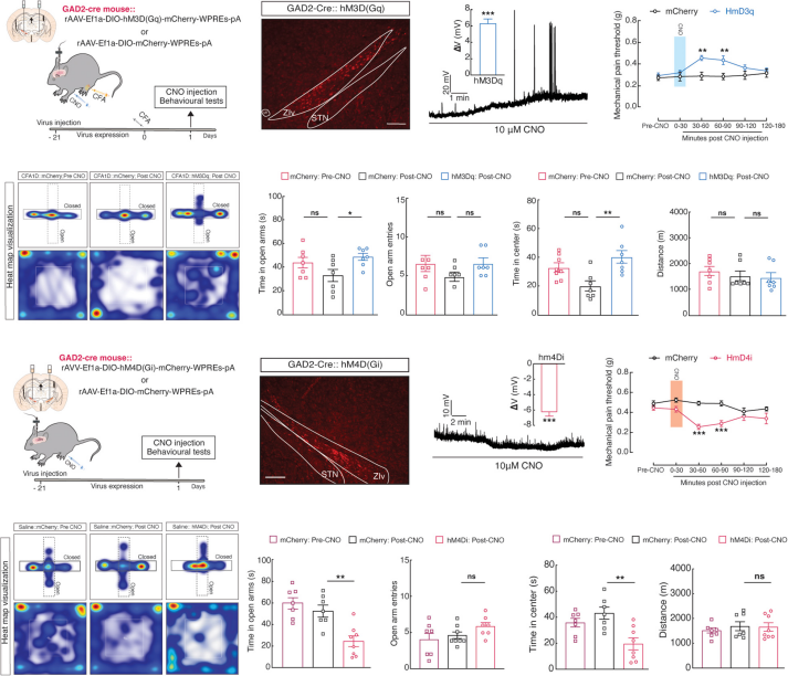 Experimental Results: To investigate the relief effect of activating ZIvGABA neurons on pain-related anxiety behaviors, AAV-DIO-hM3Dq-mCherry was injected into the ZI region of GAD2-Cre mice, followed by intraperitoneal CNO injection to activate ZIvGABA neurons. Electrophysiological validation (current clamp mode) showed that after 10 μM CNO treatment, the neurons depolarized and generated action potentials. In GAD2-Cre mice with AAV-DIO-hM3Dq-mCherry injected into the ZI region, intraperitoneal CNO activation resulted in depolarization and action potential generation. A pain-related anxiety behavior model was established by injecting complete Freund's adjuvant (CFA) into the hindpaw of the mice. Behavioral testing on day 1 after injection showed increased mechanical pain thresholds and reduced anxiety. In normal GAD2-Cre mice injected with AAV-DIO-hM4Di-mCherry, CNO-induced inhibition hyperpolarized neurons, resulting in heightened pain sensitivity and anxiety-like behavior. In summary, the reduced activity of ZIvGABA neurons is a necessary and sufficient condition for acute pain and anxiety induced by CFA.