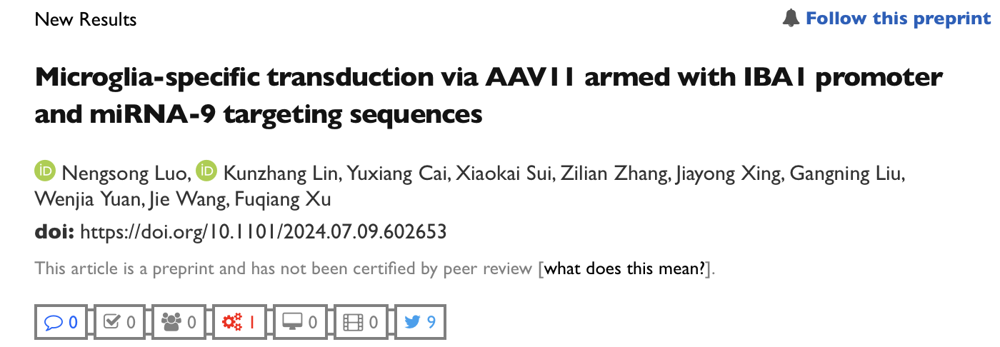By directly injecting AAV11 containing the IBA1 promoter and four tandem miR-9 targeting sequences, specific transduction of microglia in defined brain regions of adult mice was achieved. Additionally, AAV11 shows high transduction specificity for microglia across various brain regions and the spinal cord. Furthermore, by reducing the injection dose, AAV11 can be used for sparse labeling. This work provides a powerful viral tool for studying microglial structure and function. For researchers focused on glial biology, we are very interested in collaborating with your laboratory to expand the applications of this serotype. If you are interested, please feel free to contact us at kz.lin@siat.ac.cn orBD@ebraincase.com.