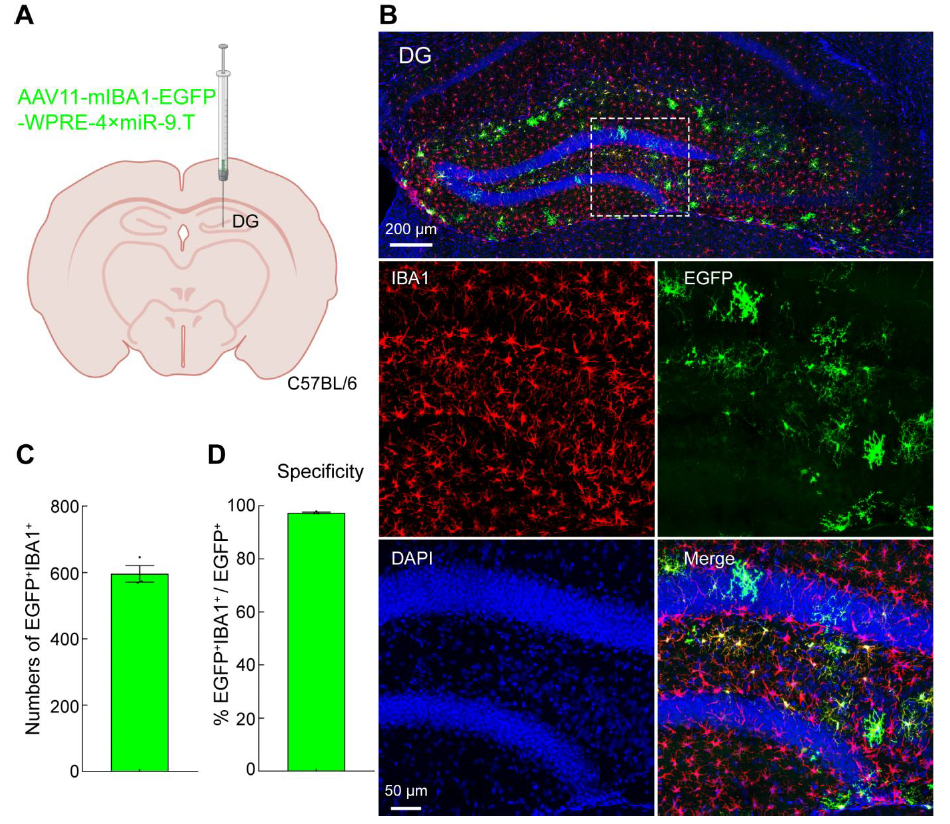 To verify whether AAV11 can efficiently transduce microglia in the DG region, AAV11 was injected at a dose of 2×10^9 VG (Figure 1A). Three weeks later, brain tissues were collected, sectioned, and subjected to immunofluorescence staining (Figure 1B). AAV11 demonstrated strong transduction capability in microglia within the hippocampal DG region (Figures 1B and 1C). Quantitative analysis of EGFP and IBA1 double-positive cells indicated that AAV11 primarily transduced microglia with approximately 97% specificity (Figure 1D).
