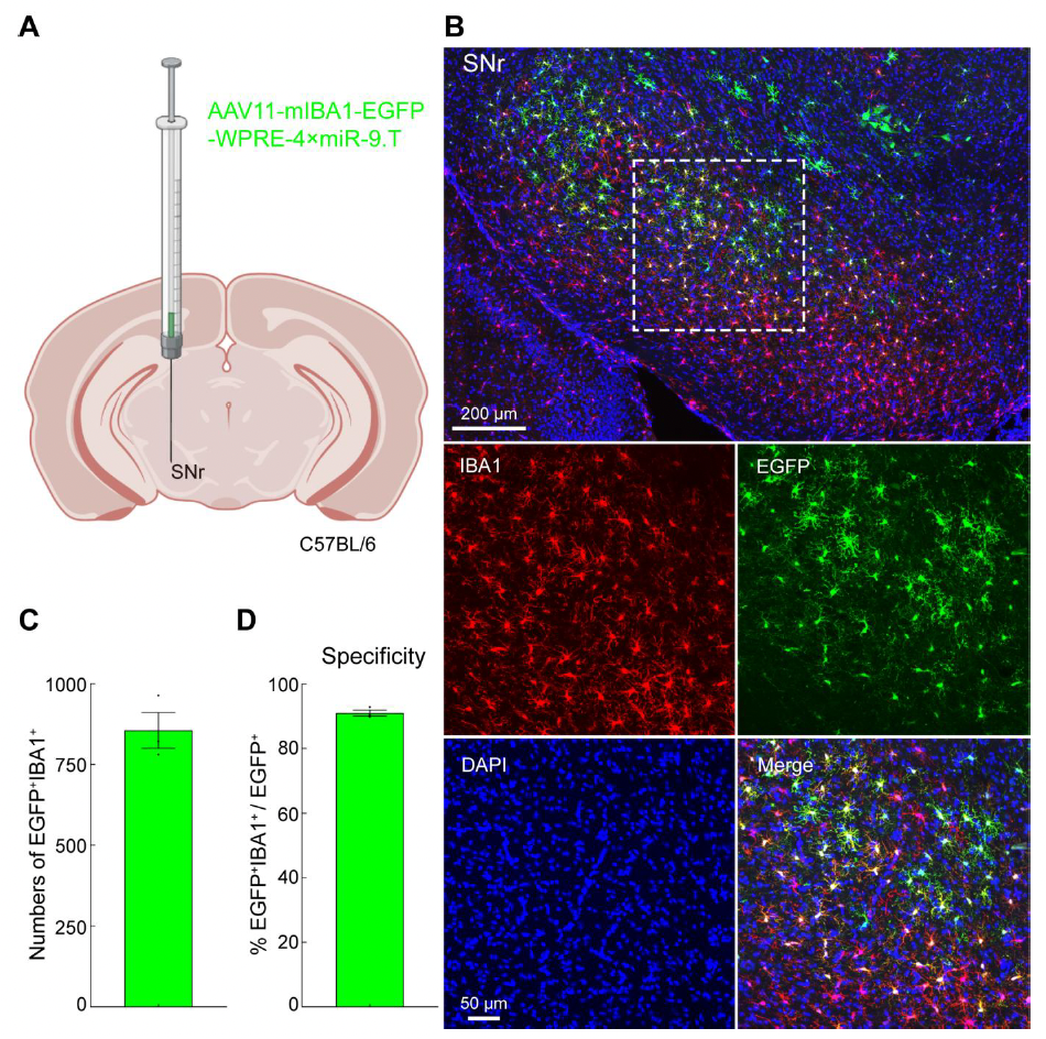 To verify the efficiency of AAV11 in transducing microglia in the SNr region, AAV11 was injected at a dose of 2×10^9 VG (Figure 2A). Three weeks later, brain tissues were collected, sectioned, and subjected to immunofluorescence staining (Figure 2B). In the SNr, most microglia were labeled with green fluorescence (Figures 2B and 2C). Fluorescence colocalization analysis showed that AAV11-mediated gene expression in SNr microglia had approximately 90% specificity (Figure 2D).