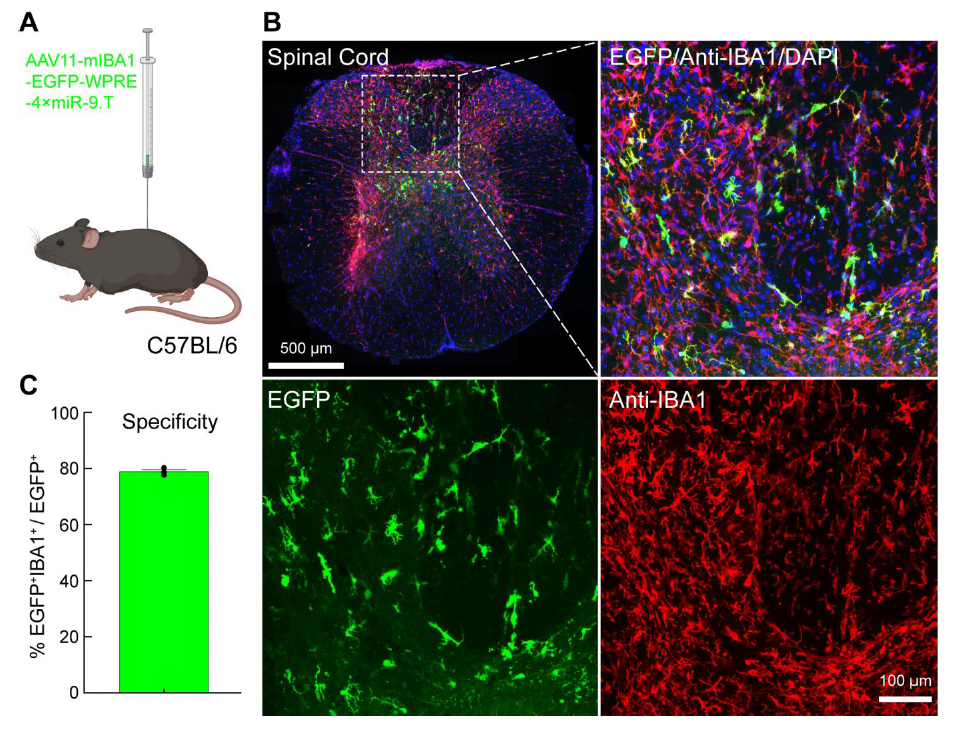 Spinal cord microglia play a crucial role in spinal cord injury repair, inflammation regulation, pain generation, and the development of potential therapeutic strategies. Therefore, developing a gene delivery system targeting spinal cord microglia is essential. The authors investigated whether AAV11 could efficiently transduce spinal cord microglia. AAV11 was injected into the lumbar segment at a dose of 5×10^9 VG (Figure 3A). Three weeks later, spinal cord tissues were collected, sectioned, and subjected to immunofluorescence staining (Figure 3B). Quantitative analysis of EGFP and IBA1 double-positive cells indicated that AAV11 exhibited strong transduction efficiency in spinal cord microglia, with approximately 80% specificity (Figures 3B and 3C).