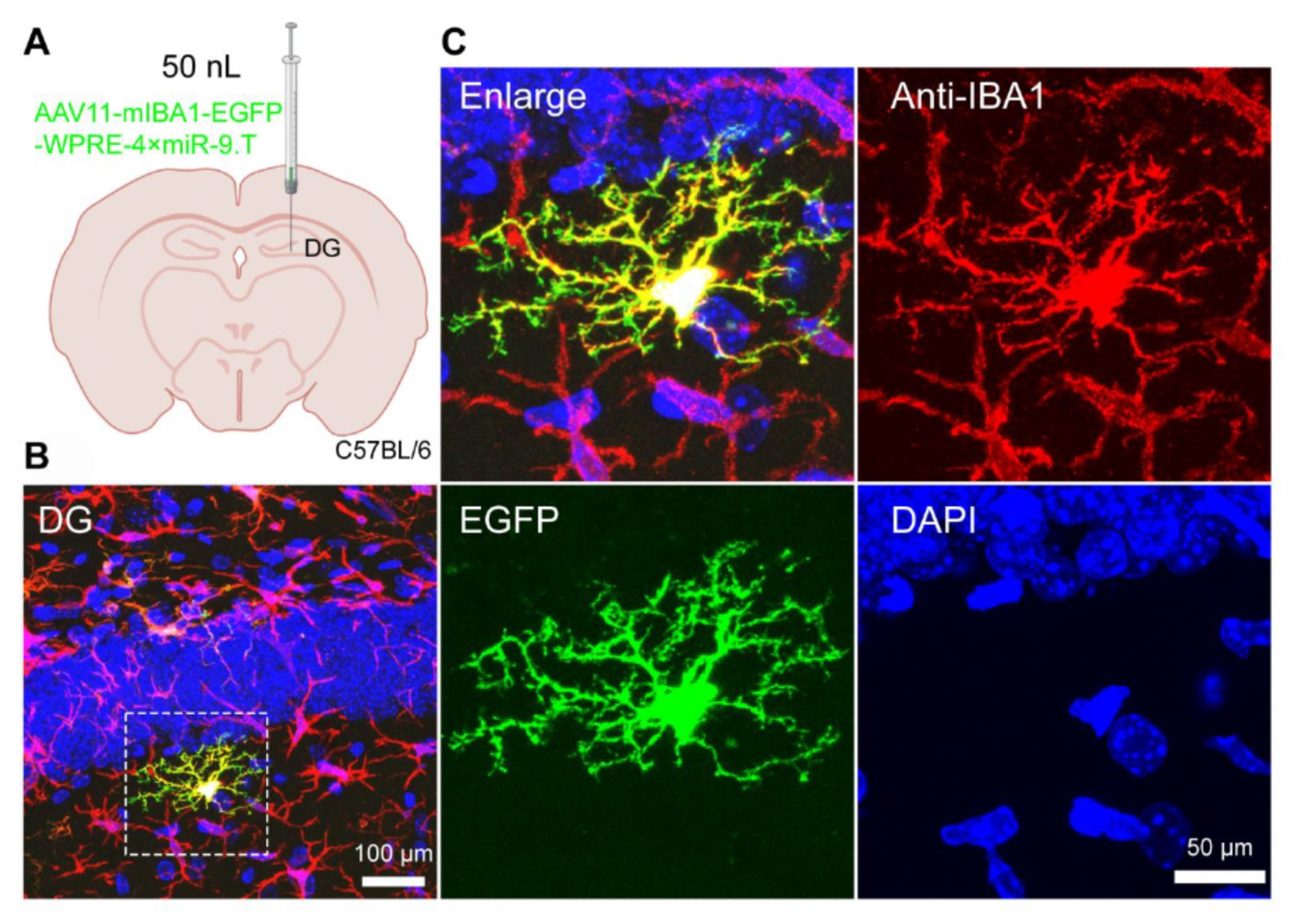 Figure 1. AAV11 efficiently and specifically transduces microglia in the DG brain region